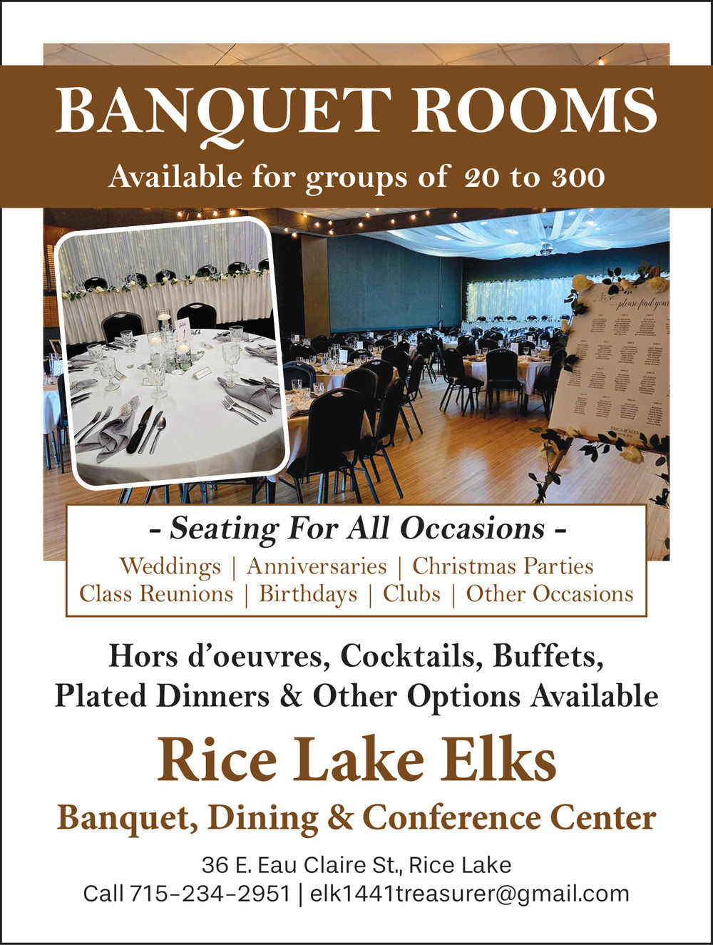 Feb 27, 2026. Rice Lake Elks Banquet, Dining & Conference Center Event Center Ads from Rice Lake Chronotype