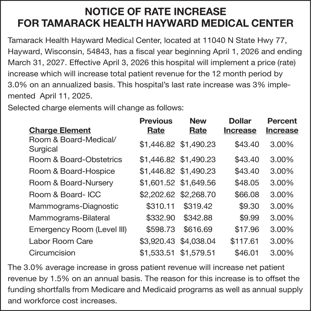 Mar 04, 2026. Tamarack Health Hayward Medical Center Medical Ads from Sawyer County Record