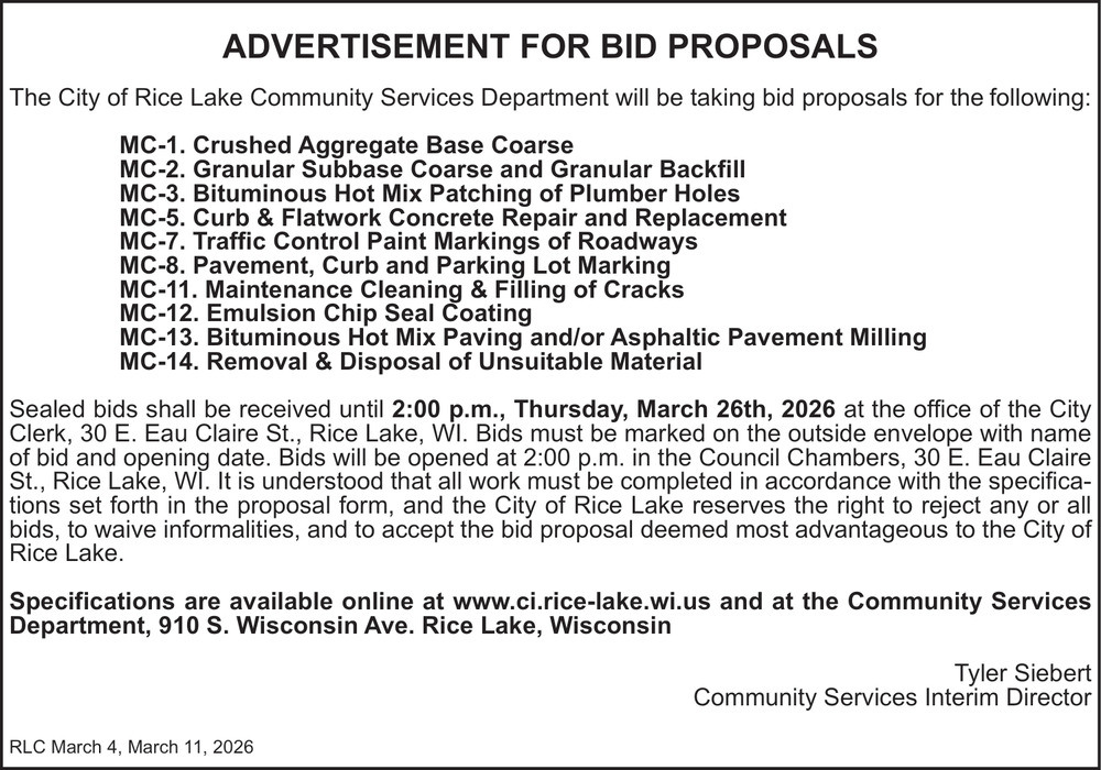 Mar 04, 2026. City of Rice Lake Public Notice Ads from Rice Lake Chronotype