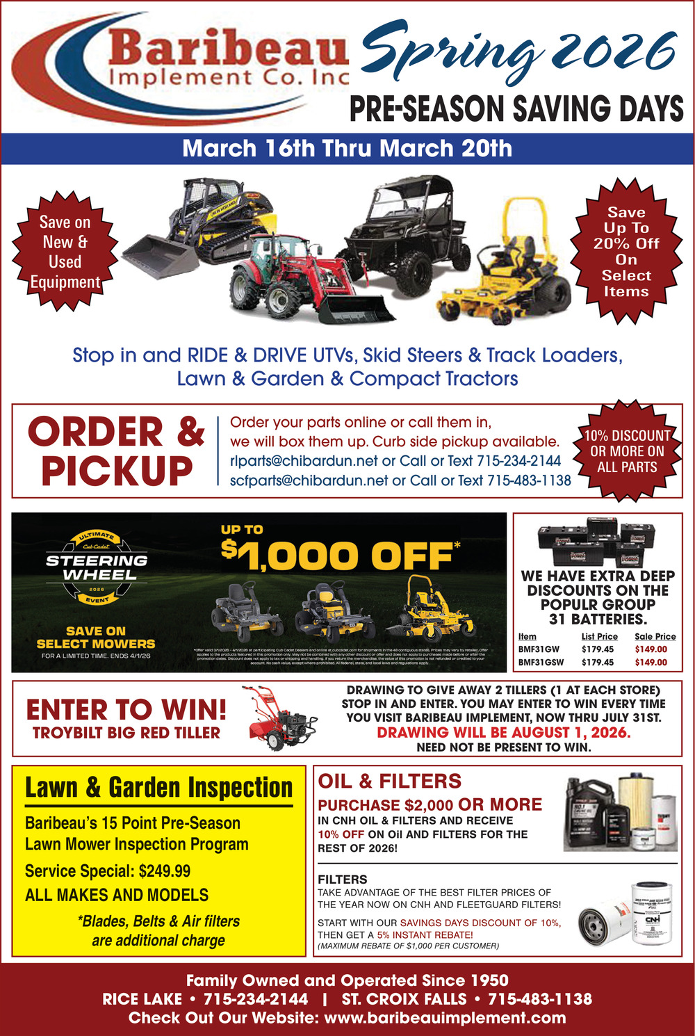 Mar 04, 2026. Baribeau Implement Co. Inc. Equipment Ads from Rice Lake Chronotype