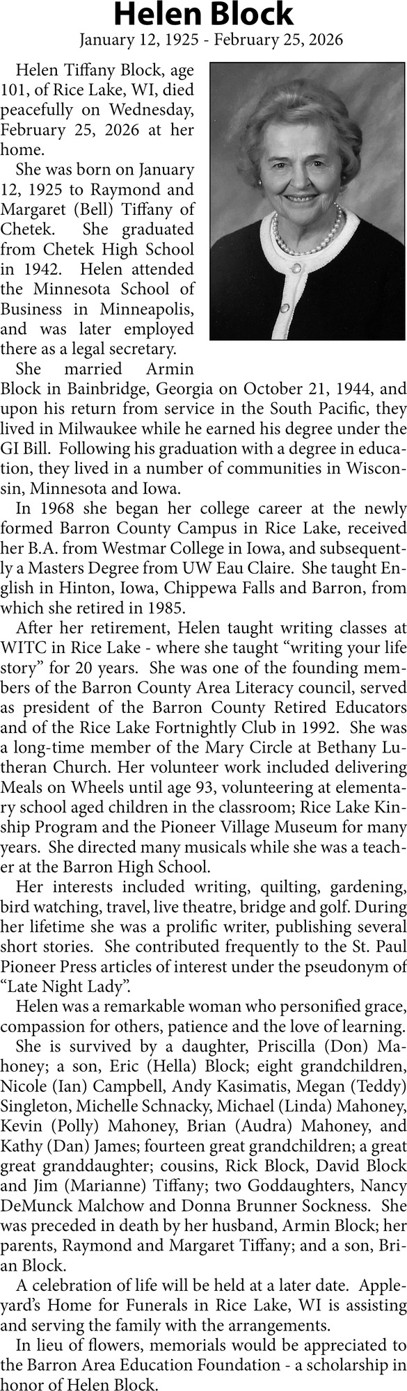 Mar 04, 2026. Obituaries Obituaries Ads from Rice Lake Chronotype