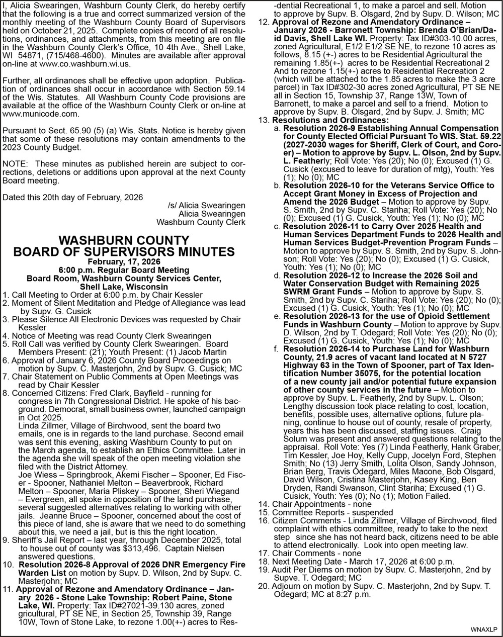 Mar 05, 2026. Washburn County Public Notice Ads from Spooner Advocate