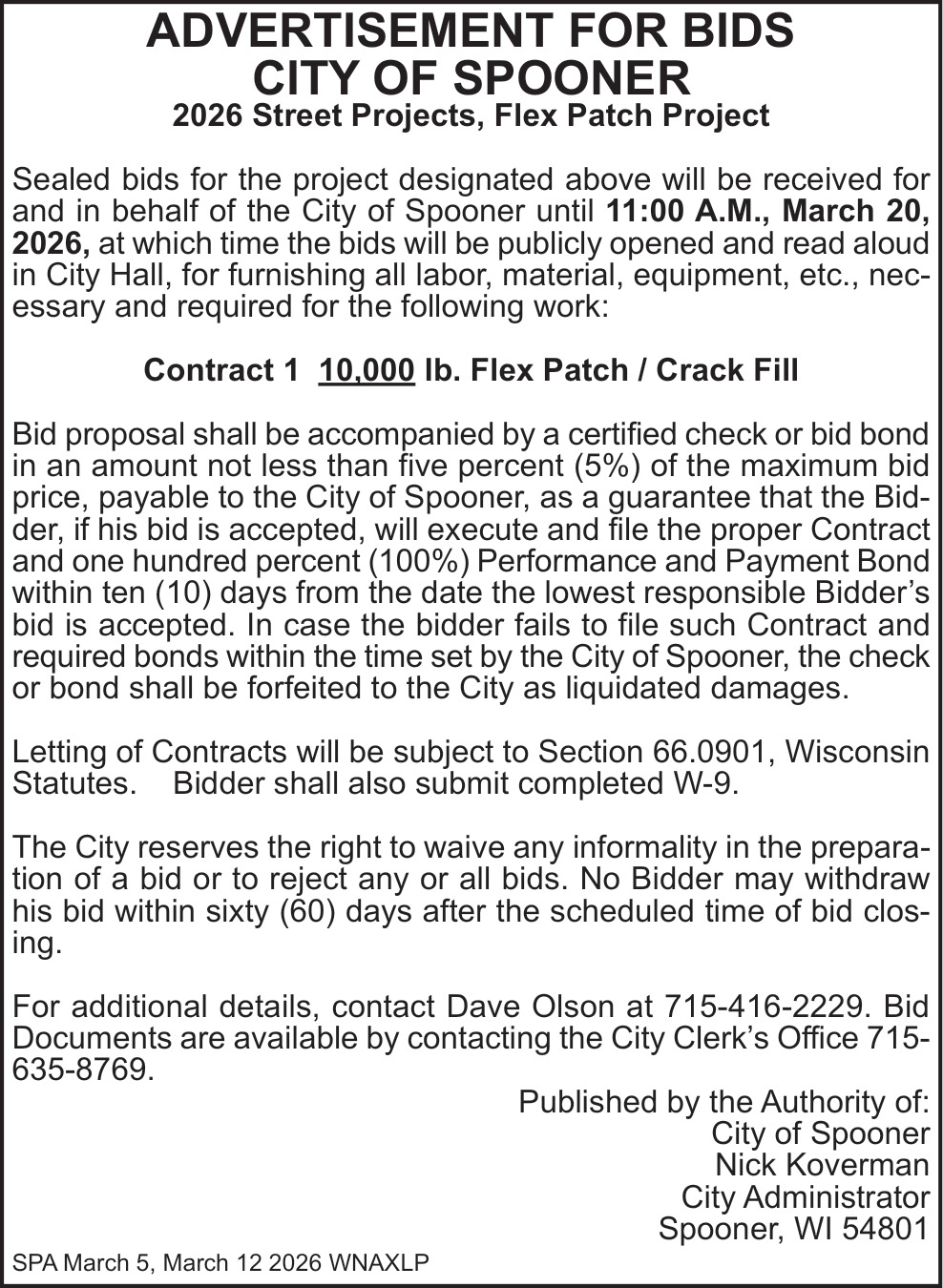 Mar 05, 2026. City of Spooner Public Notice Ads from Spooner Advocate