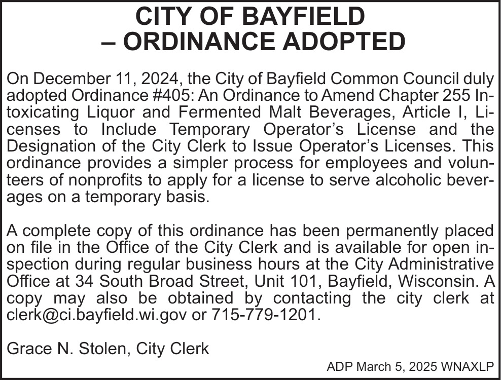 Mar 05, 2026. City of Bayfield Public Notice Ads from Ashland Daily Press
