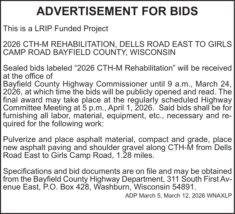 Mar 05, 2026. Bayfield County Highway Department Public Notice Ads from Ashland Daily Press