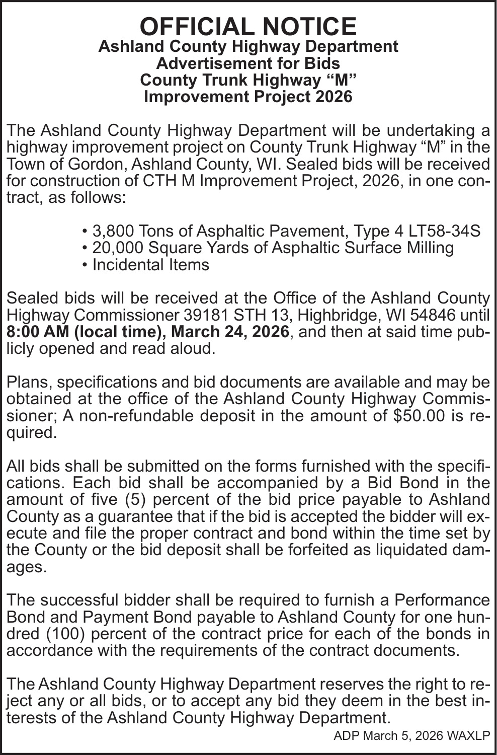 Mar 05, 2026. Ashland County Highway Department Public Notice Ads from Ashland Daily Press