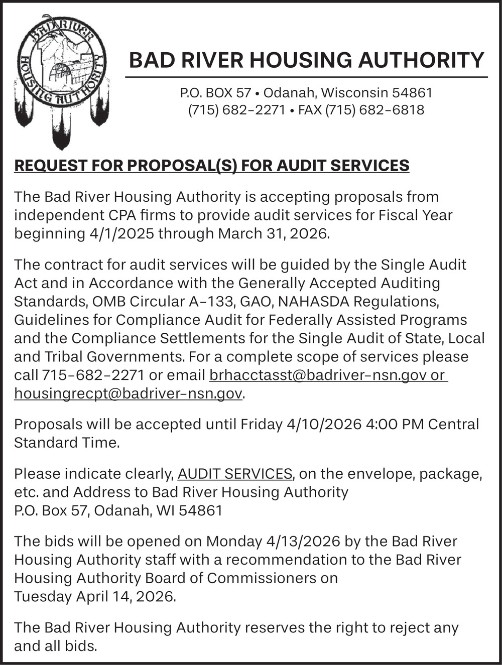 Mar 11, 2026. Bad River Housing Authority Public Notice Ads from Spooner Advocate
