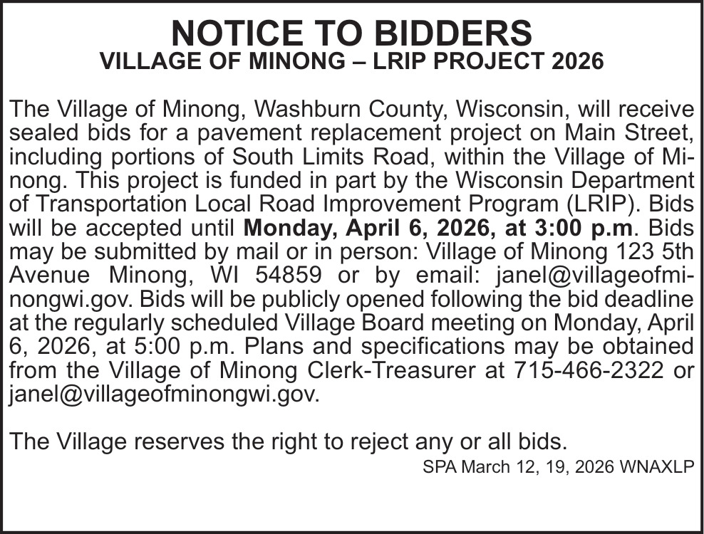 Mar 12, 2026. Village of Minong Public Notice Ads from Spooner Advocate