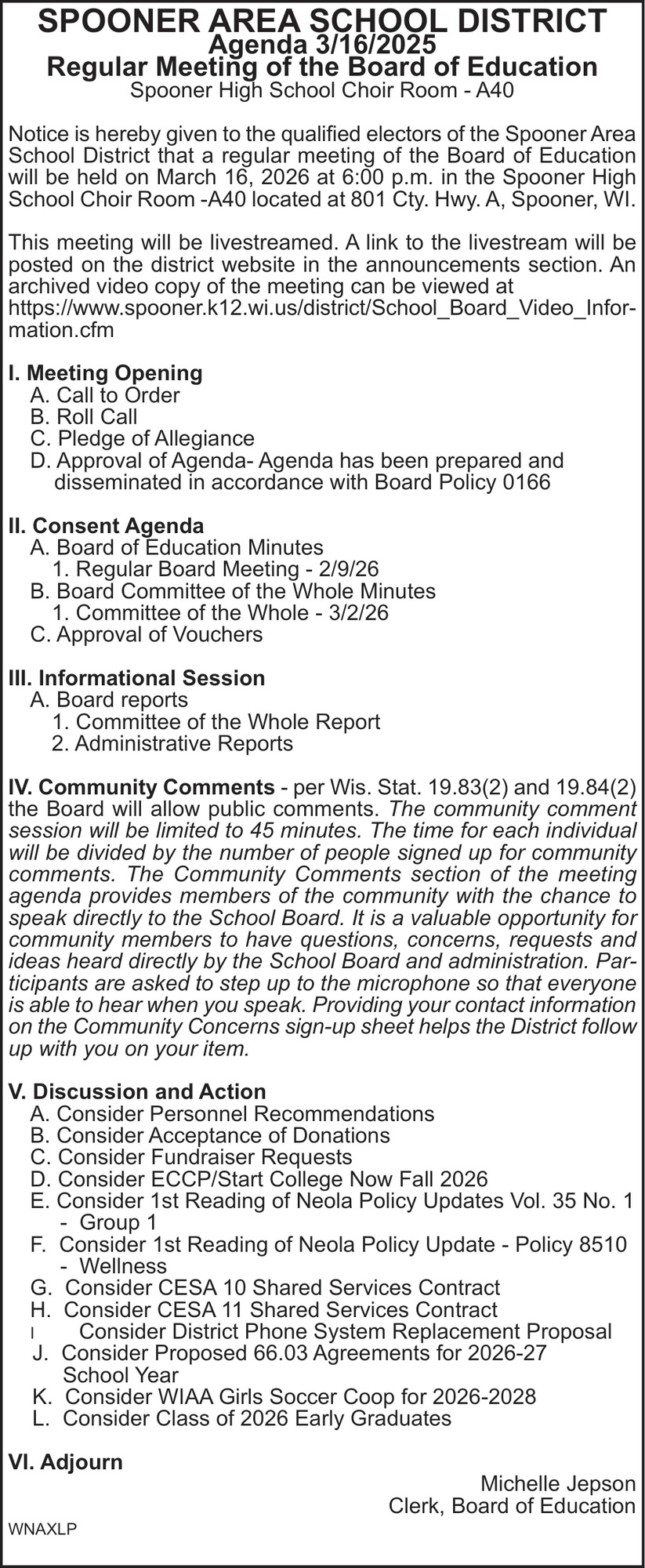 Mar 12, 2026. Spooner Area School District Public Notice Ads from Spooner Advocate