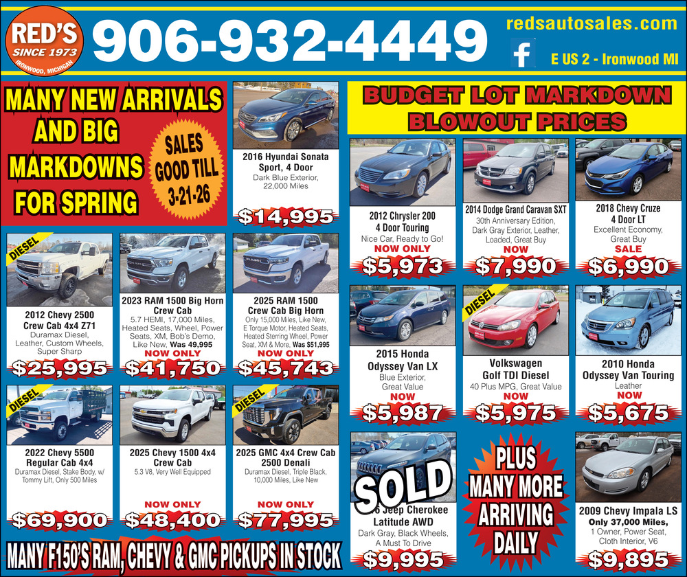 Mar 14, 2026. Red's Auto Sale Automotive Ads from Ashland Daily Press