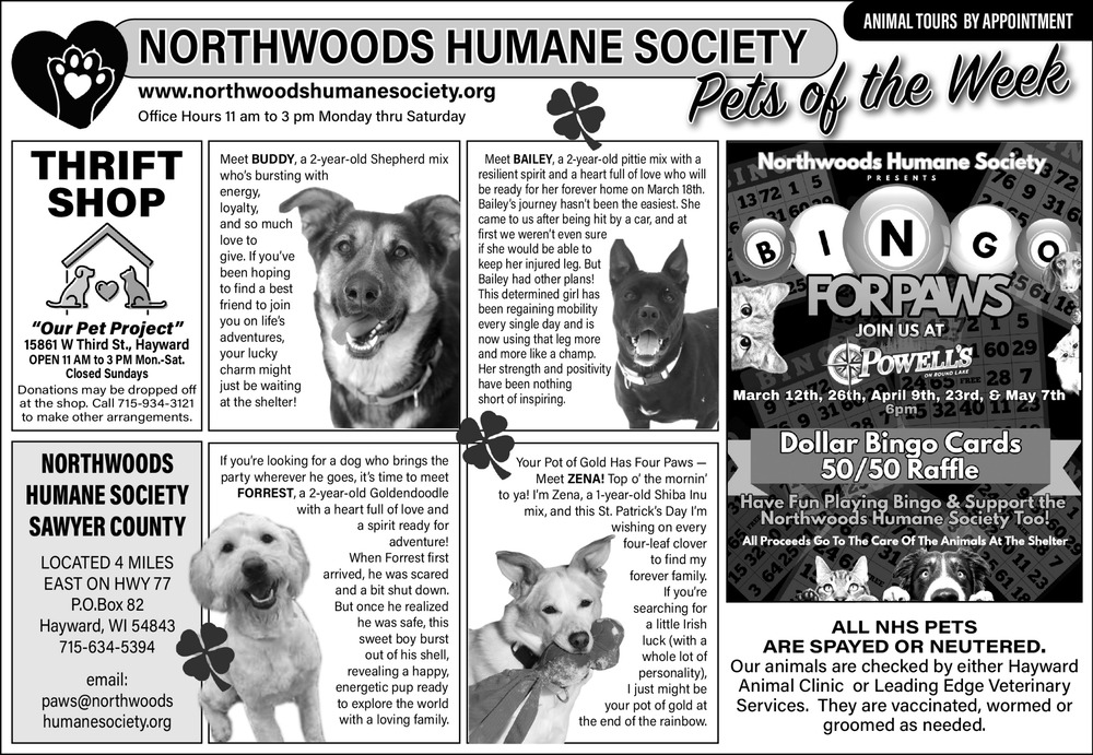 Mar 18, 2026. Northwoods Humane Society Organization Ads from Sawyer County Record