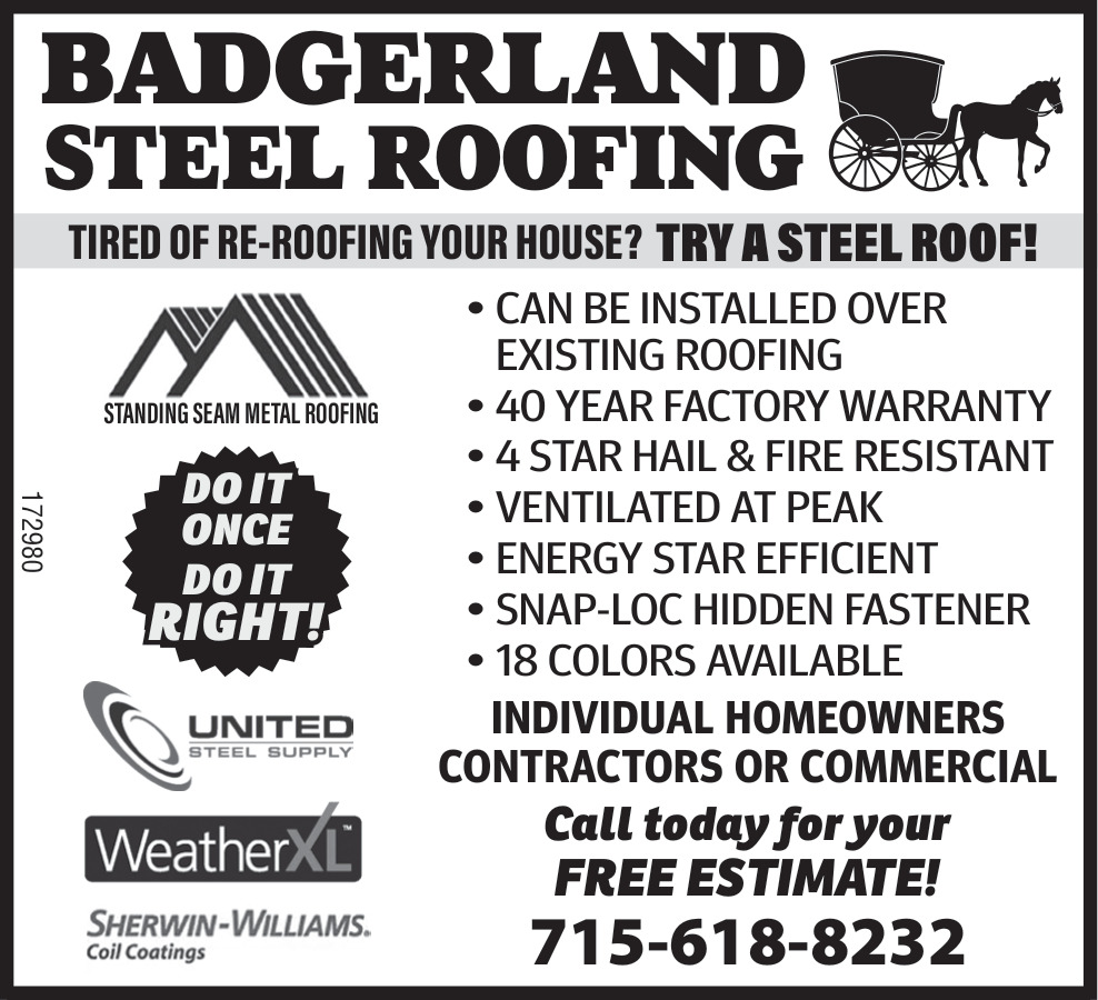 Ads for Badgerland Steel Roofing in NORTHWESTERN WISCONSIN