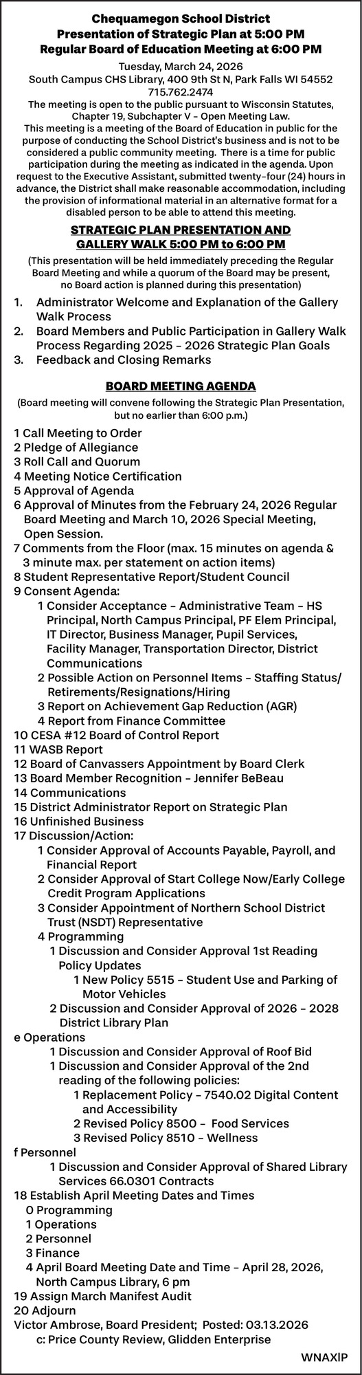 Mar 19, 2026. Chequamegon School District Public Notice Ads from Price County Review