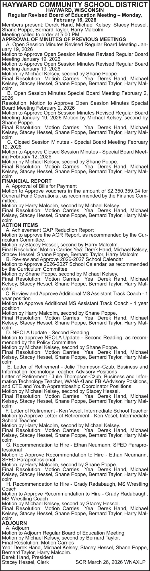 Mar 25, 2026. Hayward Community School District Public Notice Ads from Sawyer County Record