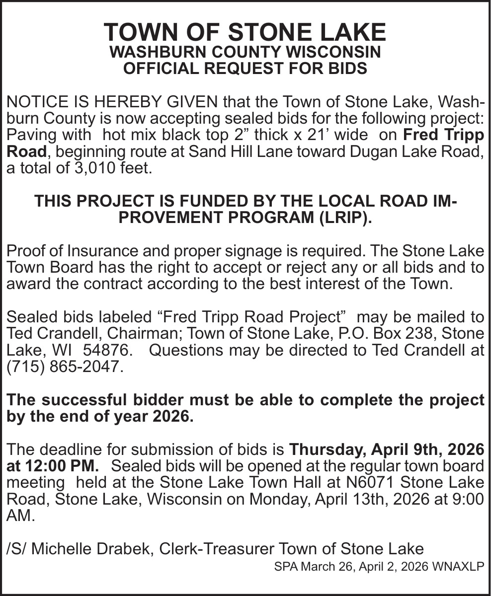 Mar 26, 2026. Town of Stone Lake Public Notice Ads from Spooner Advocate