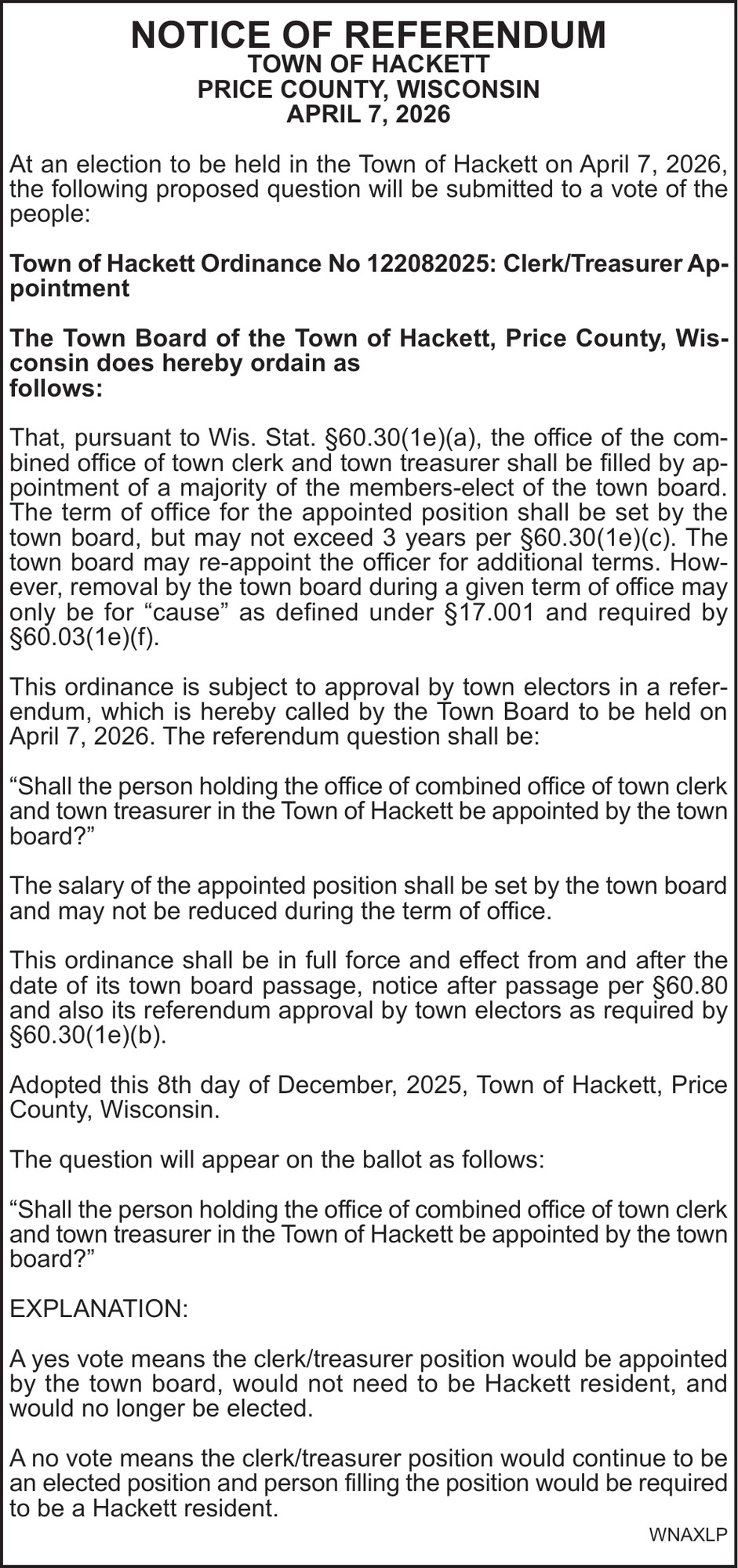 Mar 26, 2026. Town of Hackett Public Notice Ads from Price County Review