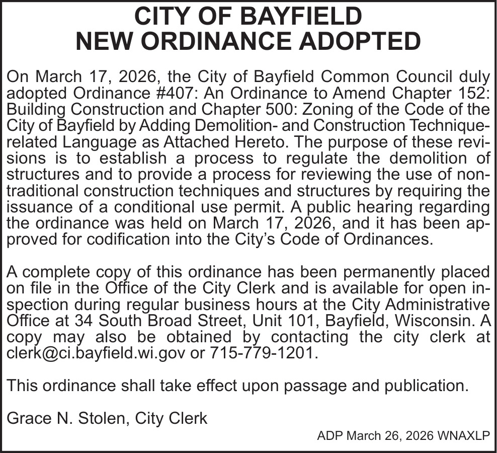 Mar 26, 2026. City of Bayfield Public Notice Ads from Ashland Daily Press