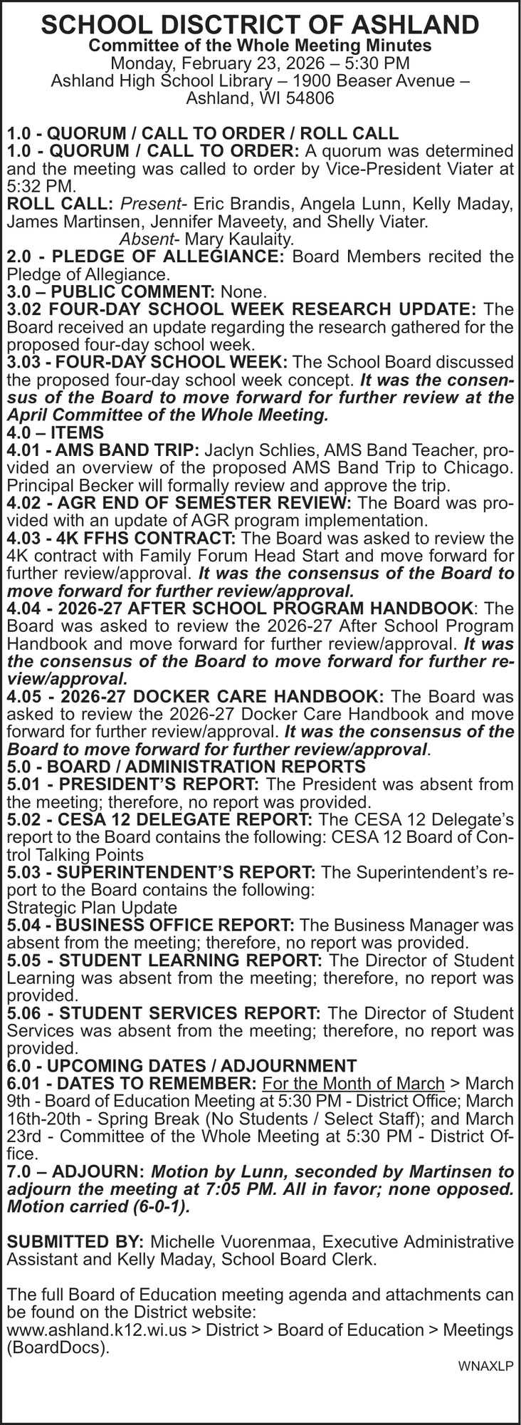 Mar 26, 2026. School District of Ashland Public Notice Ads from Ashland Daily Press