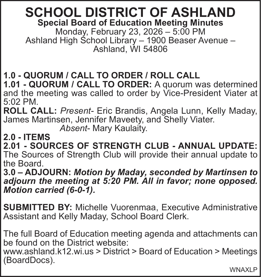 Mar 26, 2026. School District of Ashland Public Notice Ads from Ashland Daily Press