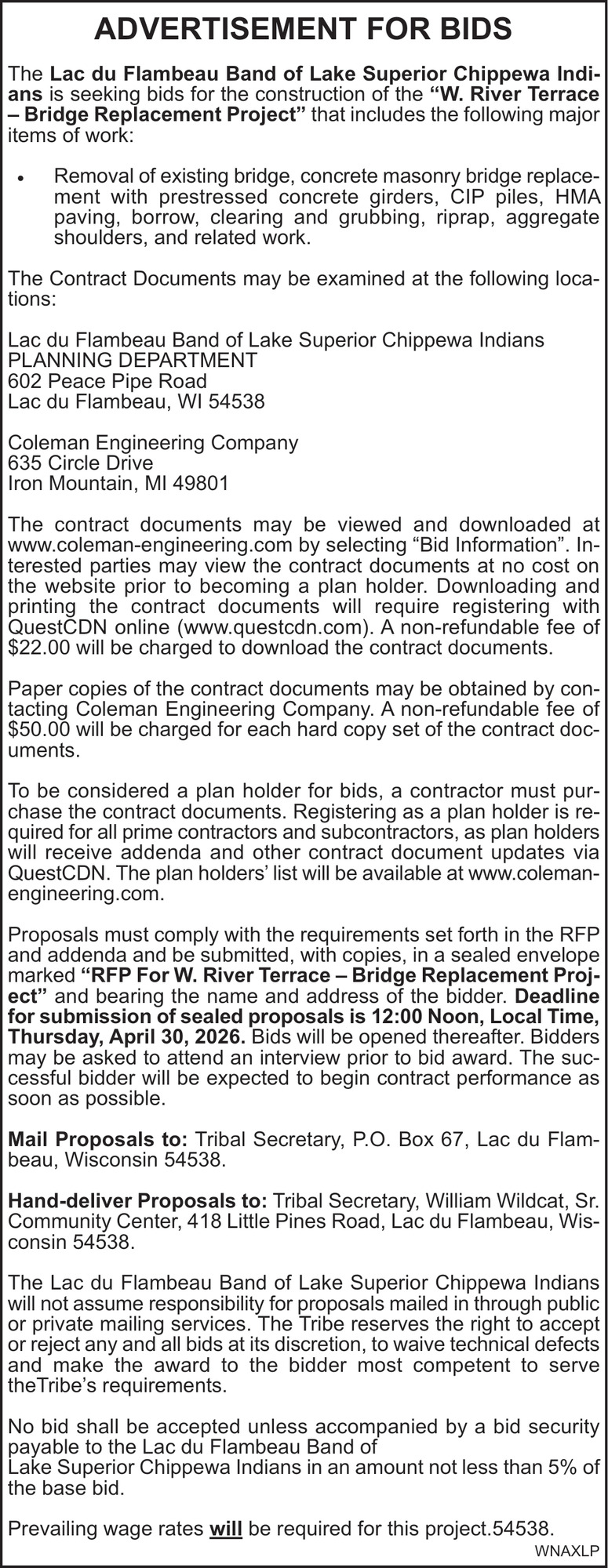 Apr 01, 2026. Lac Du Flambeau Band of Lake Superior Chippewa Indians Public Notice Ads from Sawyer County Record