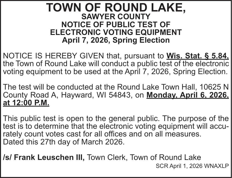 Apr 01, 2026. Town of Round Lake Public Notice Ads from Sawyer County Record
