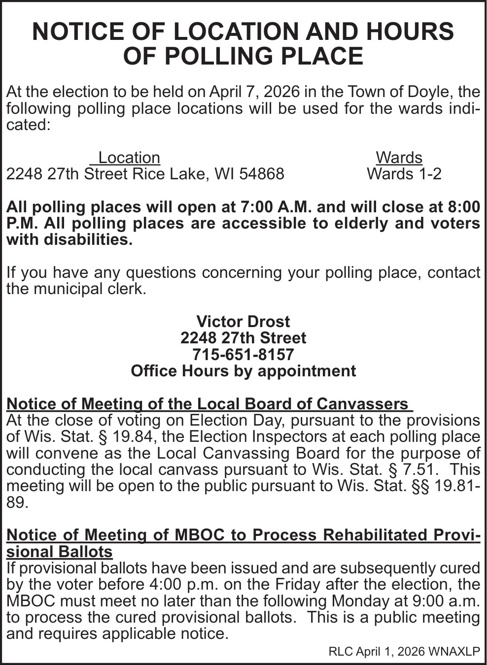 Apr 01, 2026. Town of Doyle Public Notice Ads from Rice Lake Chronotype