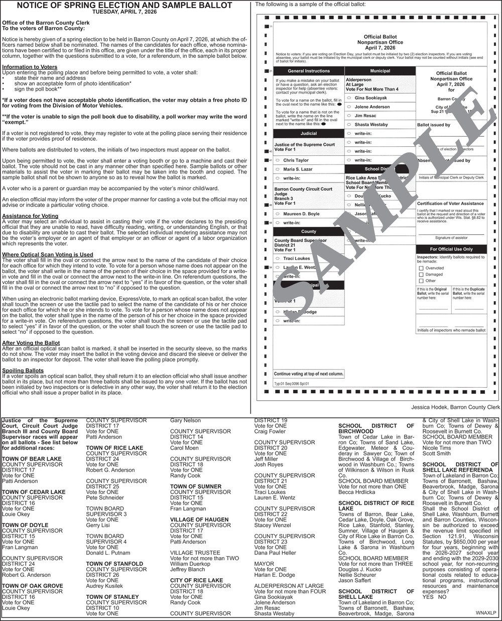 Apr 01, 2026. Barron County Public Notice Ads from Rice Lake Chronotype