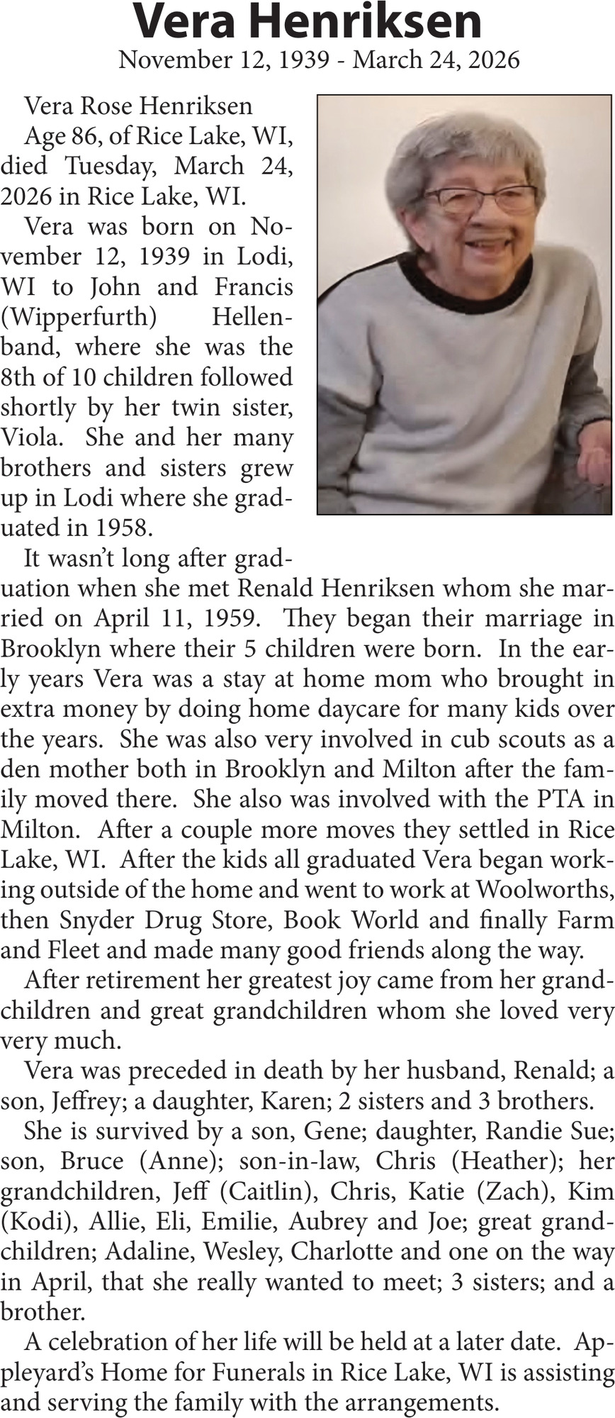 Obituary in NORTHWESTERN WISCONSIN