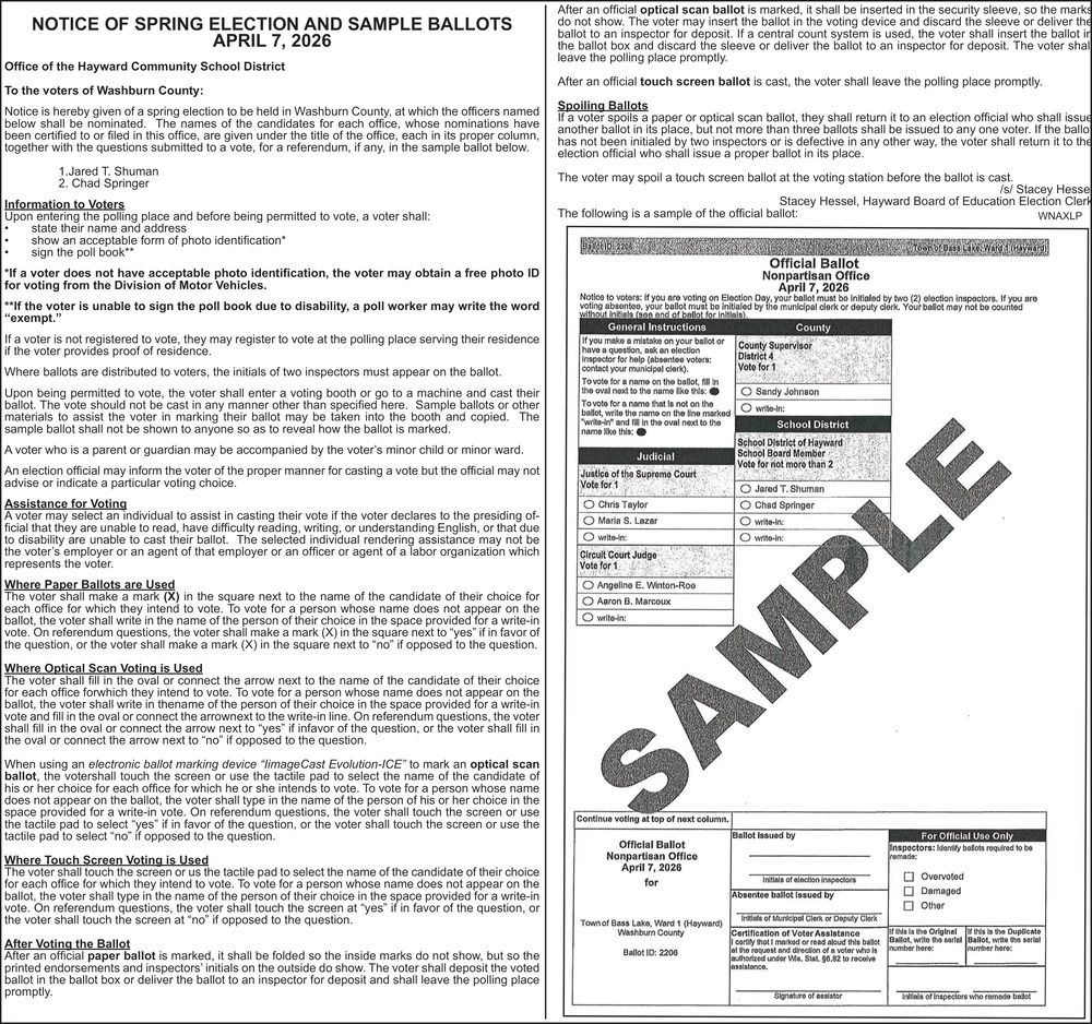 Apr 02, 2026. Hayward Community School District Public Notice Ads from Spooner Advocate