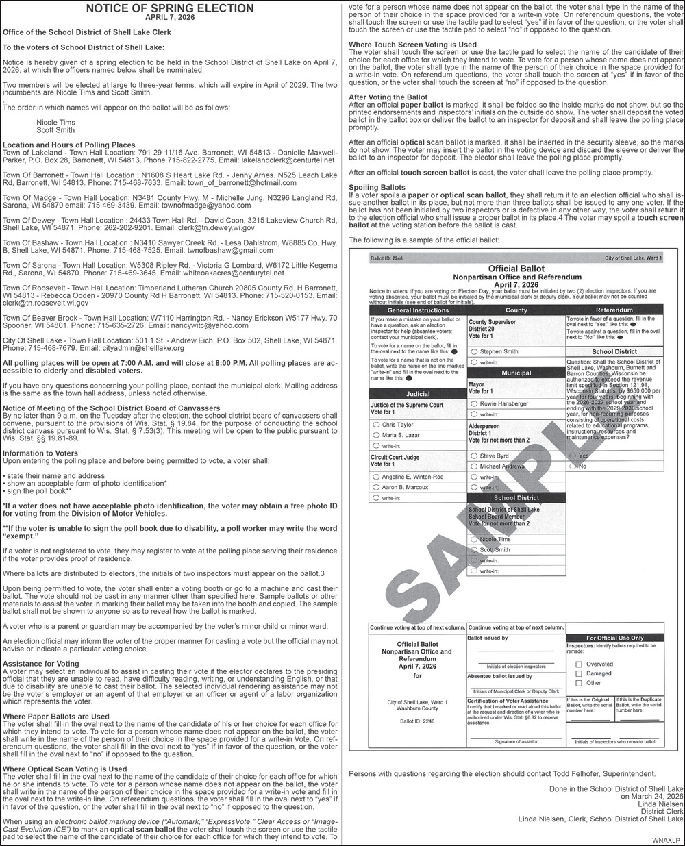 Apr 02, 2026. Shell Lake School District Public Notice Ads from Spooner Advocate