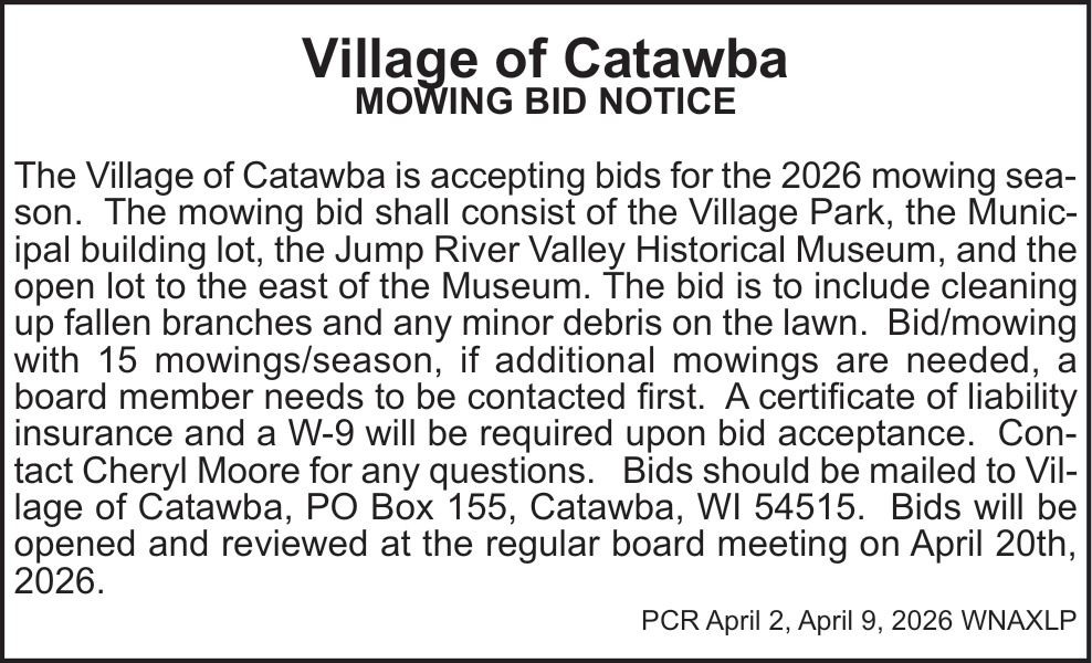Apr 02, 2026. Village of Catawba Public Notice Ads from Price County Review