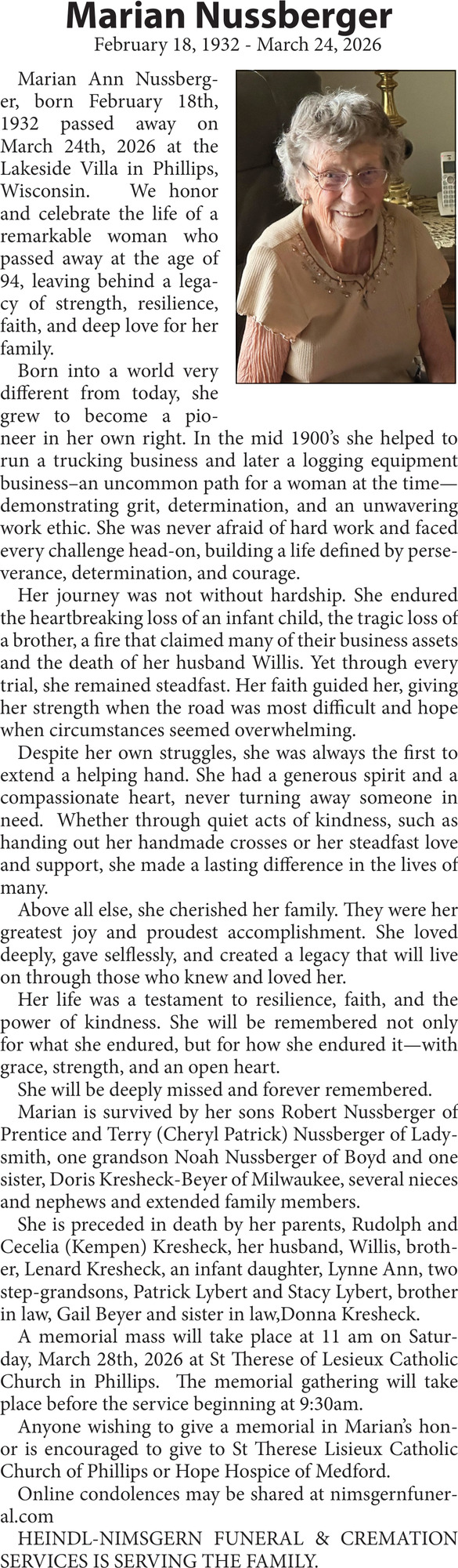 Apr 02, 2026. Heindl-Nimsgern Funeral Home Obituaries Ads from Price County Review