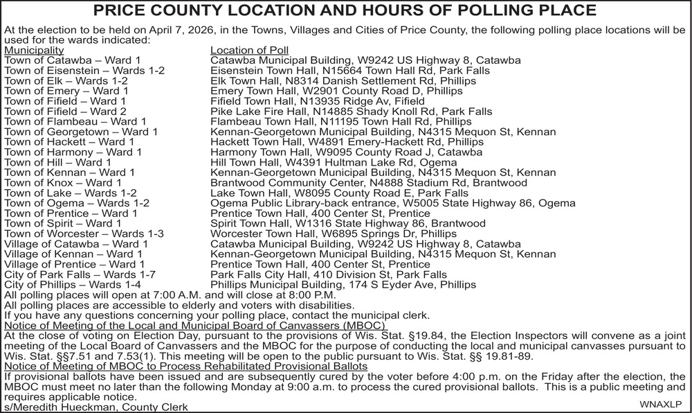 Apr 02, 2026. Price County Public Notice Ads from Price County Review