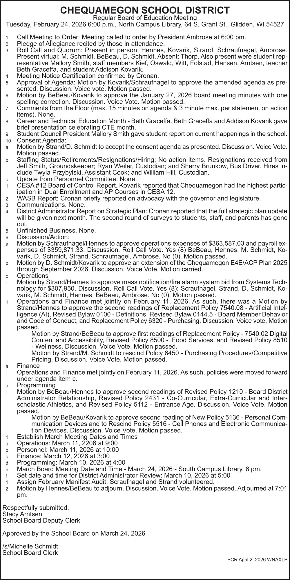 Apr 02, 2026. Chequamegon School District Public Notice Ads from Price County Review