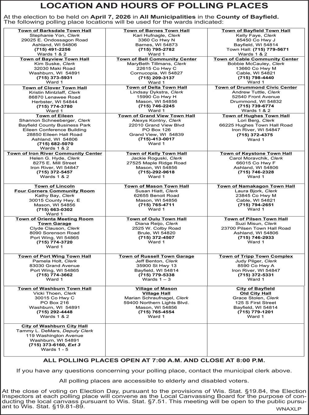Apr 02, 2026. Bayfield County Public Notice Ads from Ashland Daily Press