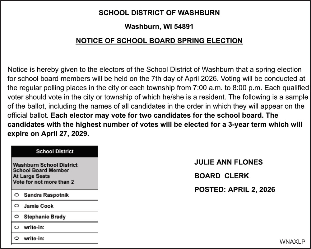 Apr 02, 2026. School District of Washburn Public Notice Ads from Ashland Daily Press