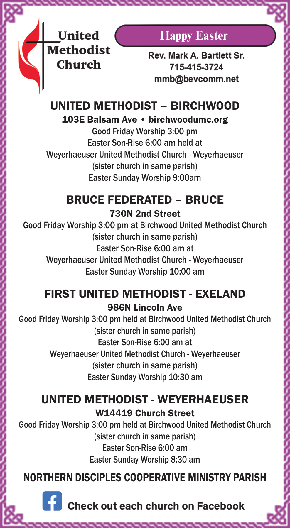 Apr 03, 2026. United Methodist Church - Birchwood/Bruce/Exeland/Weyerhaeuser Church Ads from Rice Lake Chronotype