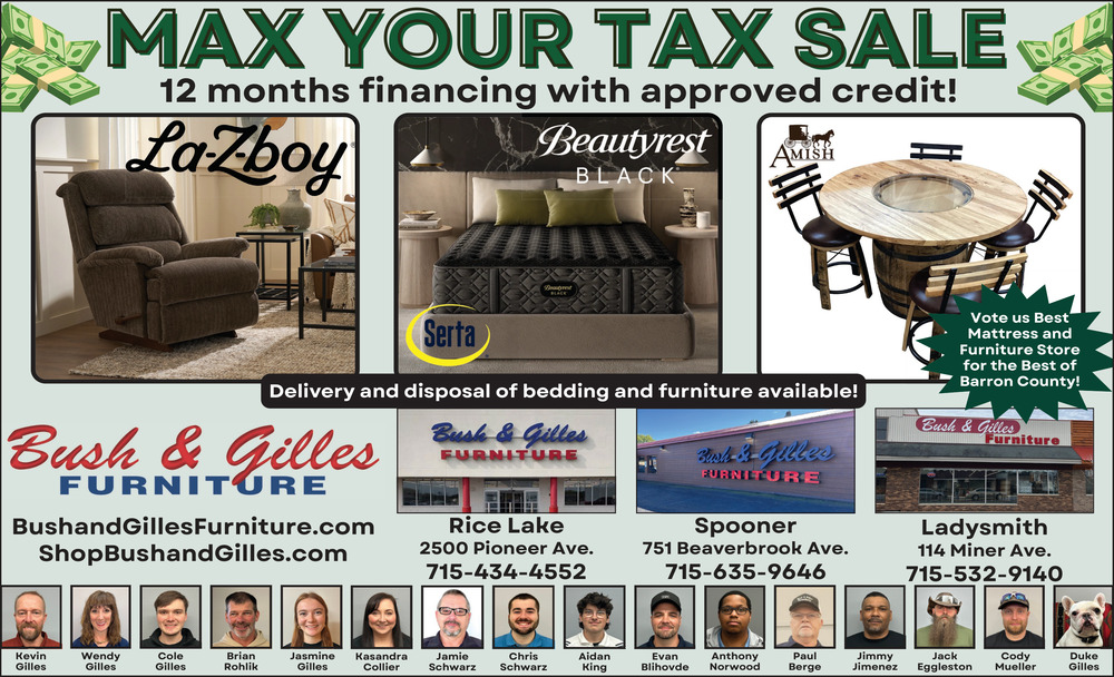 Apr 03, 2026. Bush & Gilles Furniture Home Furnishing Ads from Rice Lake Chronotype