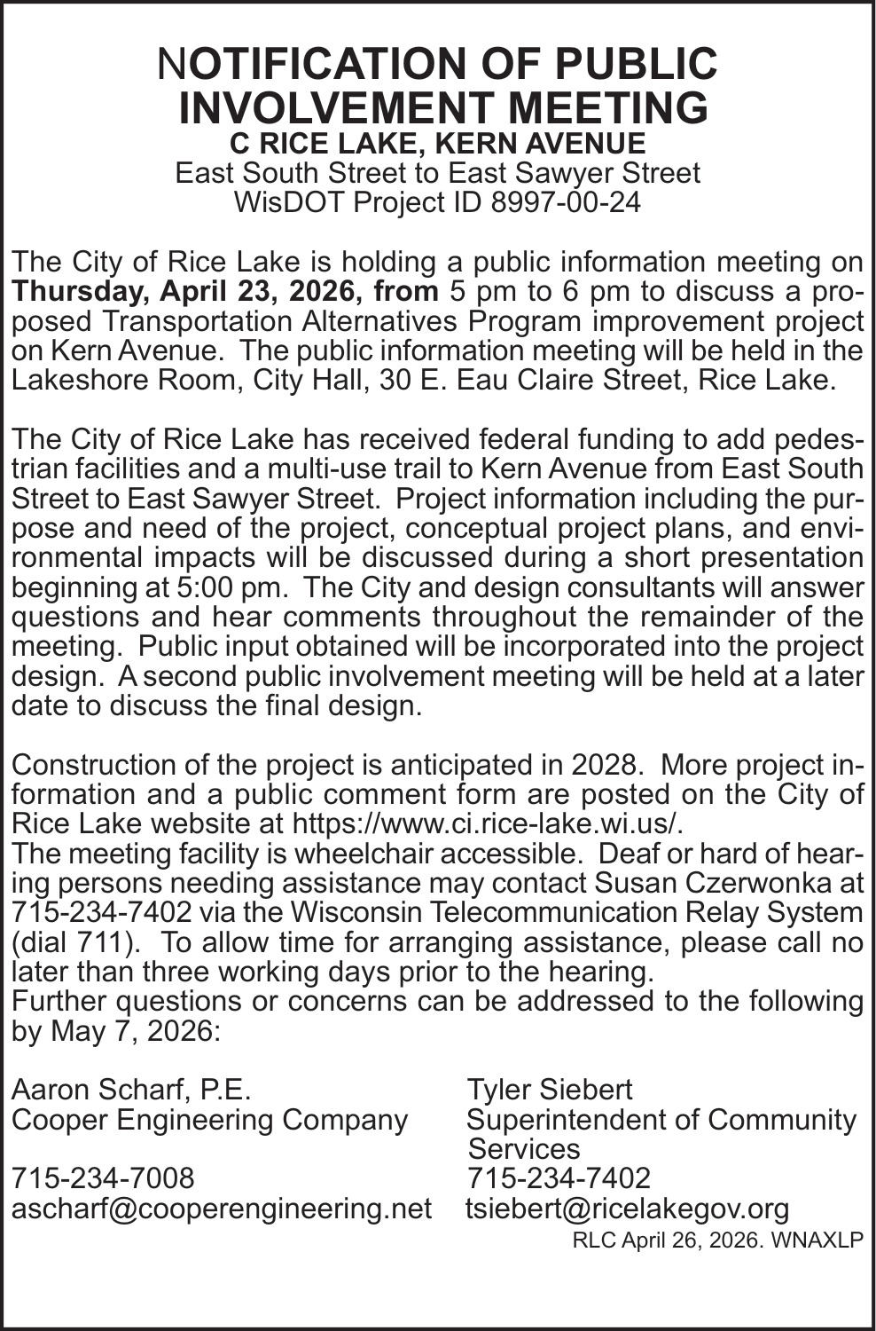 Apr 08, 2026. City of Rice Lake Utilities Ads from Rice Lake Chronotype