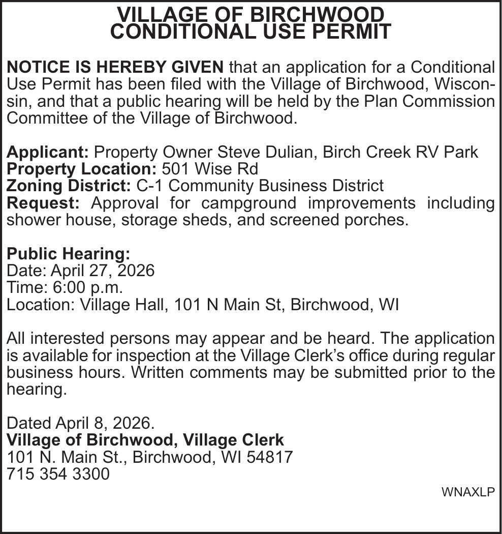 Apr 08, 2026. Village of Birchwood Public Notice Ads from Rice Lake Chronotype