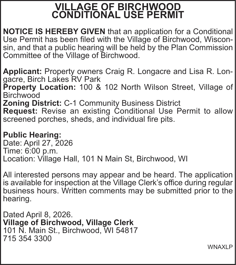 Apr 08, 2026. Village of Birchwood Public Notice Ads from Rice Lake Chronotype