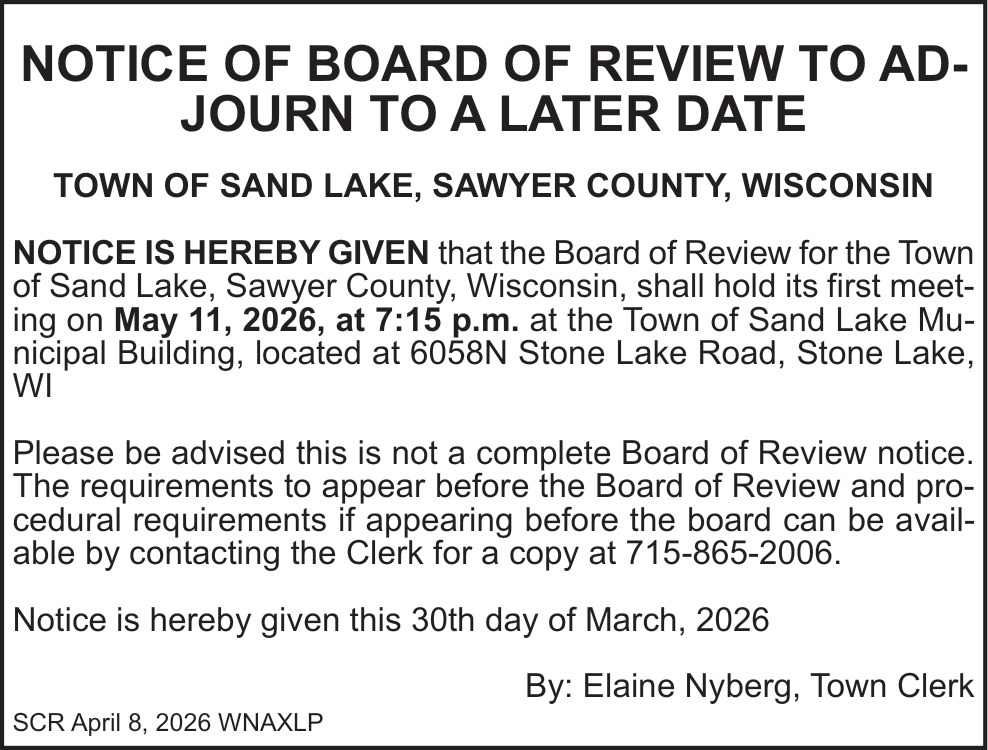 Apr 08, 2026. Town of Sand Lake Public Notice Ads from Sawyer County Record