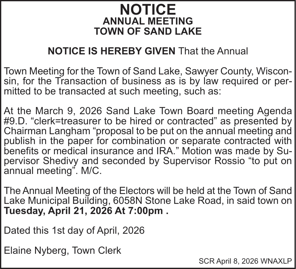 Apr 08, 2026. Town of Sand Lake Public Notice Ads from Sawyer County Record