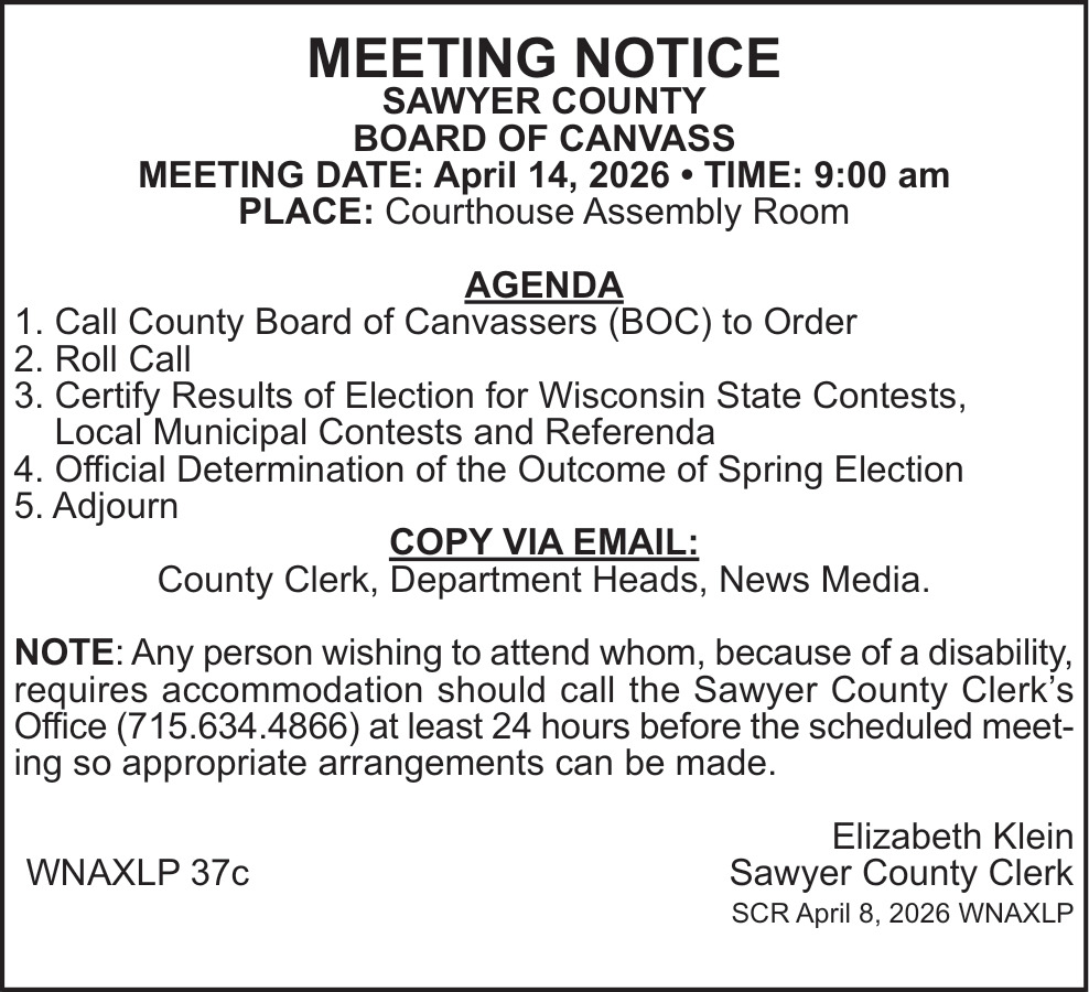 Apr 08, 2026. Sawyer County Public Notice Ads from Sawyer County Record