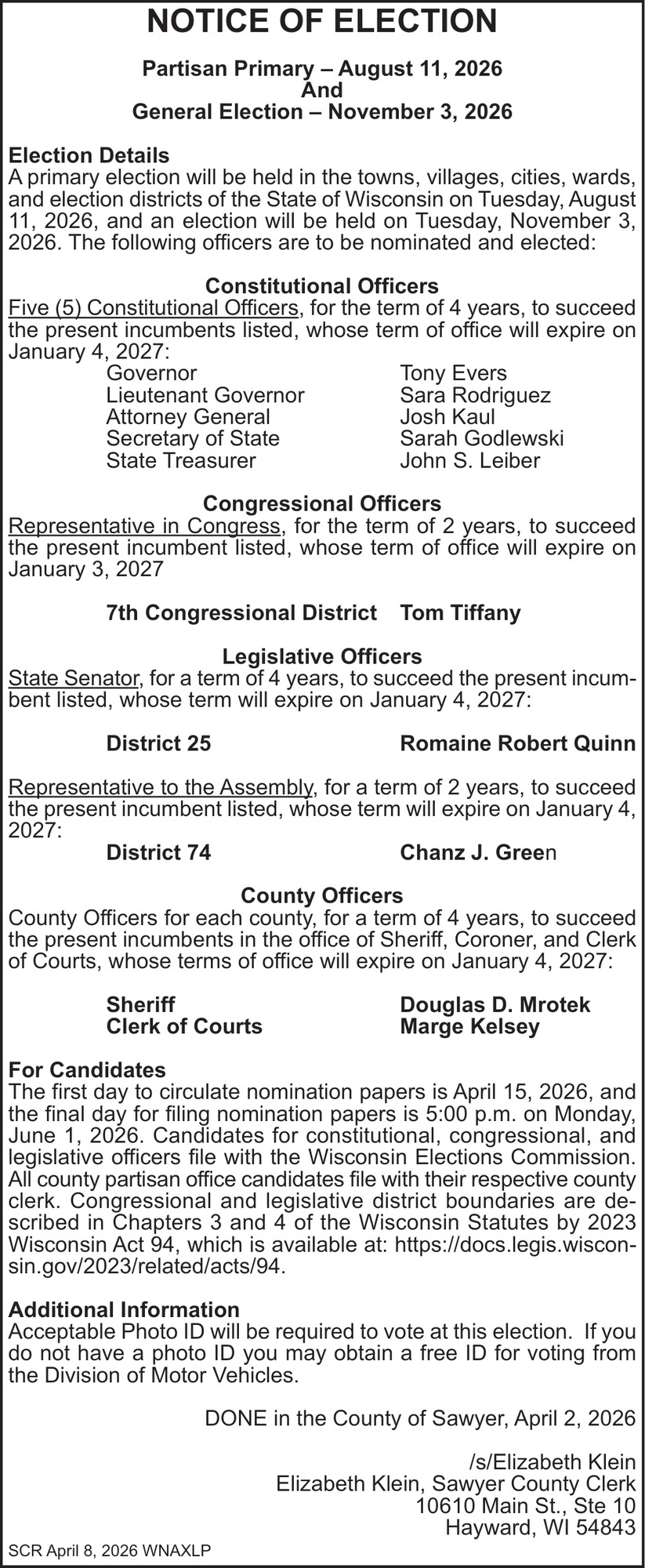 Apr 08, 2026. Sawyer County Public Notice Ads from Sawyer County Record