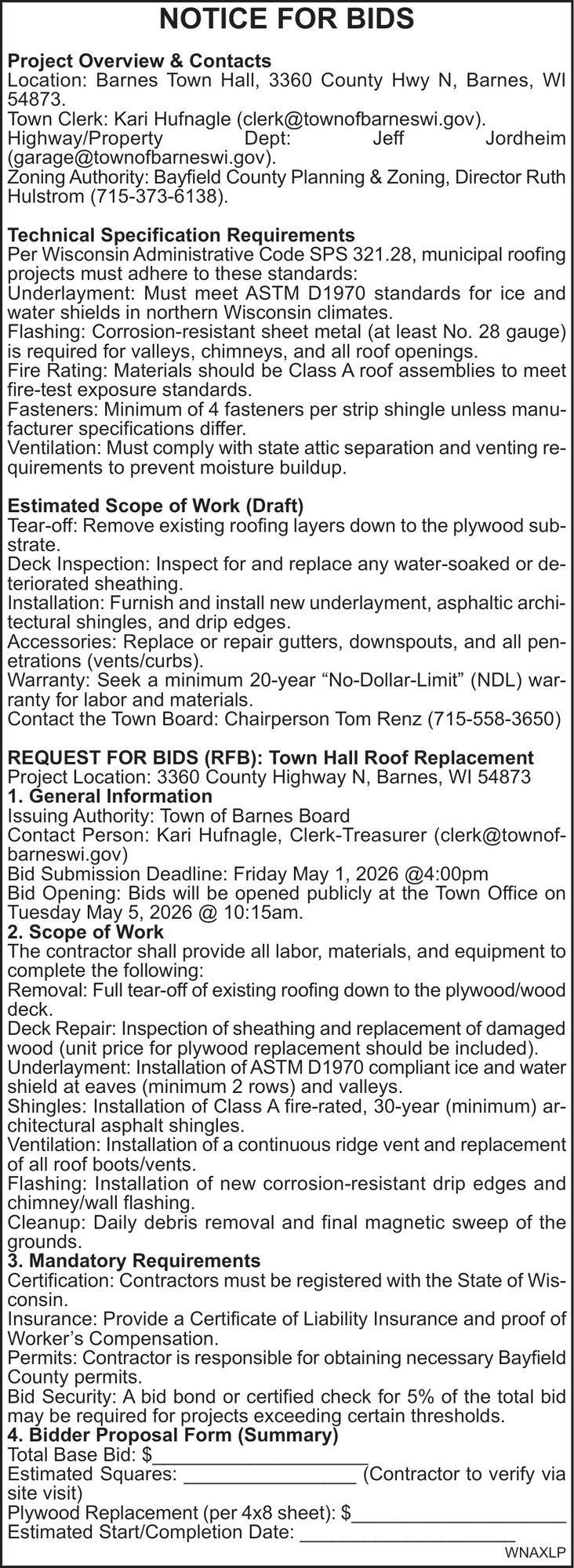 Apr 08, 2026. Town Of Barnes Public Notice Ads from Sawyer County Record
