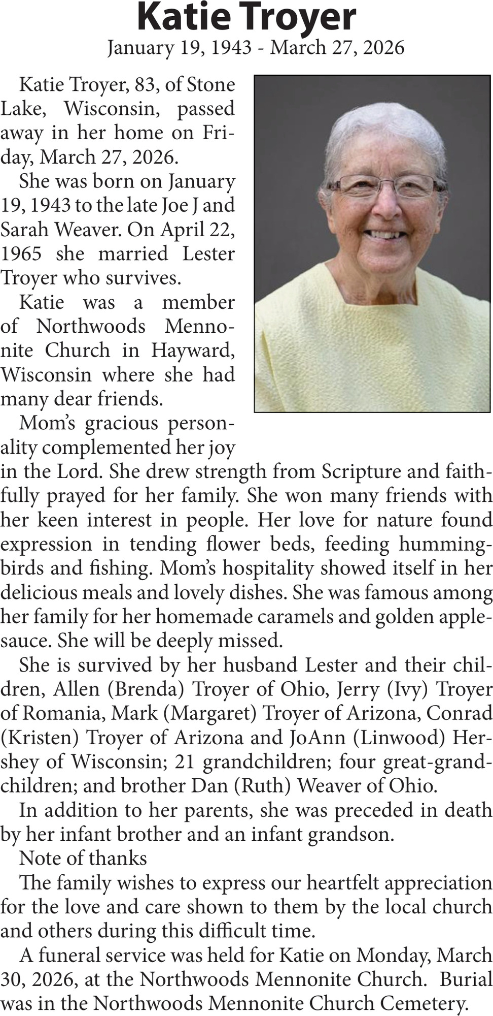 Obituary in NORTHWESTERN WISCONSIN