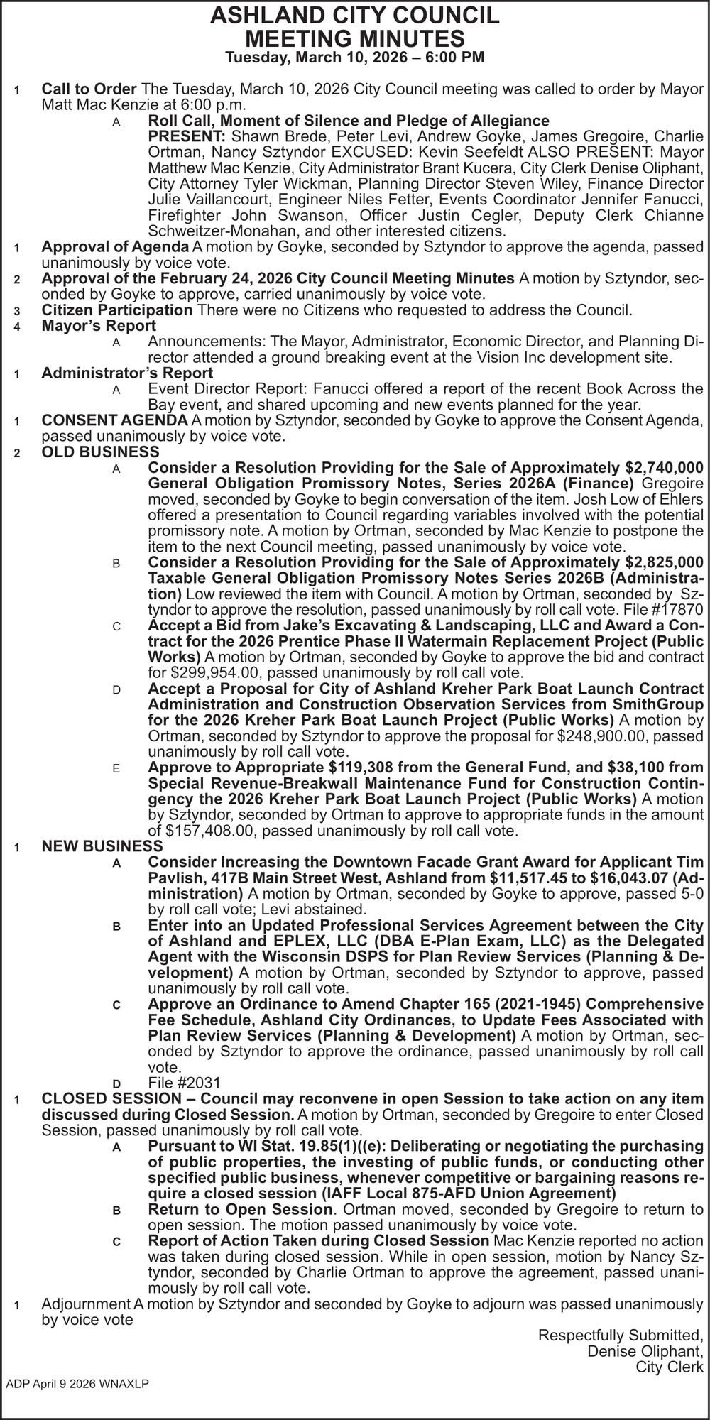 Apr 09, 2026. City Of Ashland Public Notice Ads from Ashland Daily Press