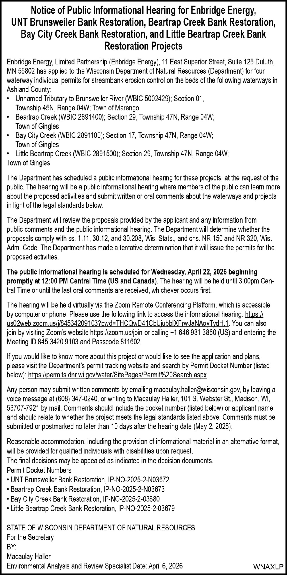 Apr 09, 2026. Department of Natural Resources - Ashland Public Notice Ads from Ashland Daily Press