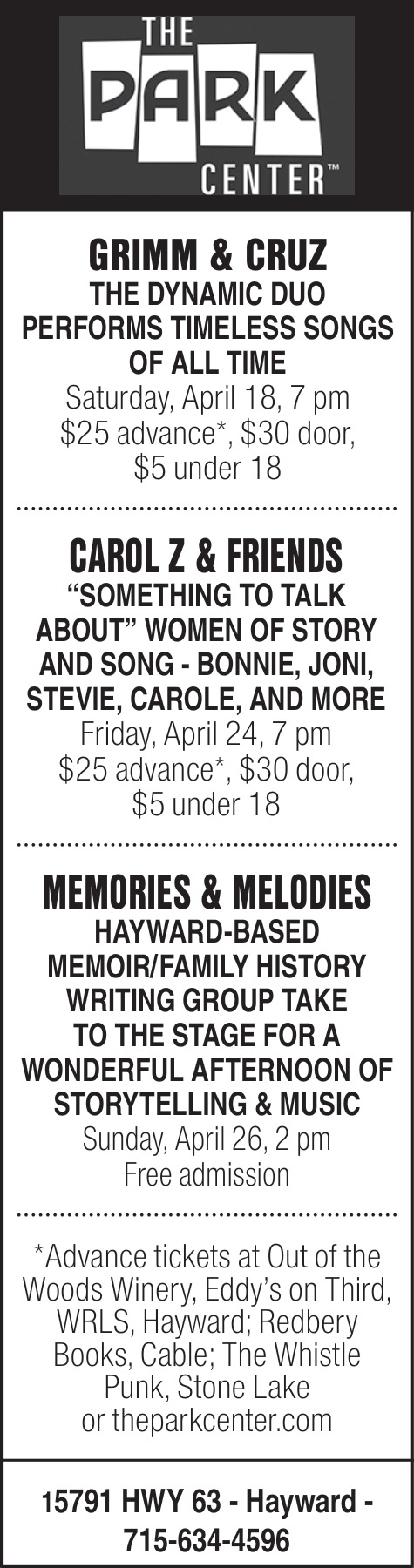 Apr 15, 2026. The Park Center Shows & Theater Ads from Sawyer County Record